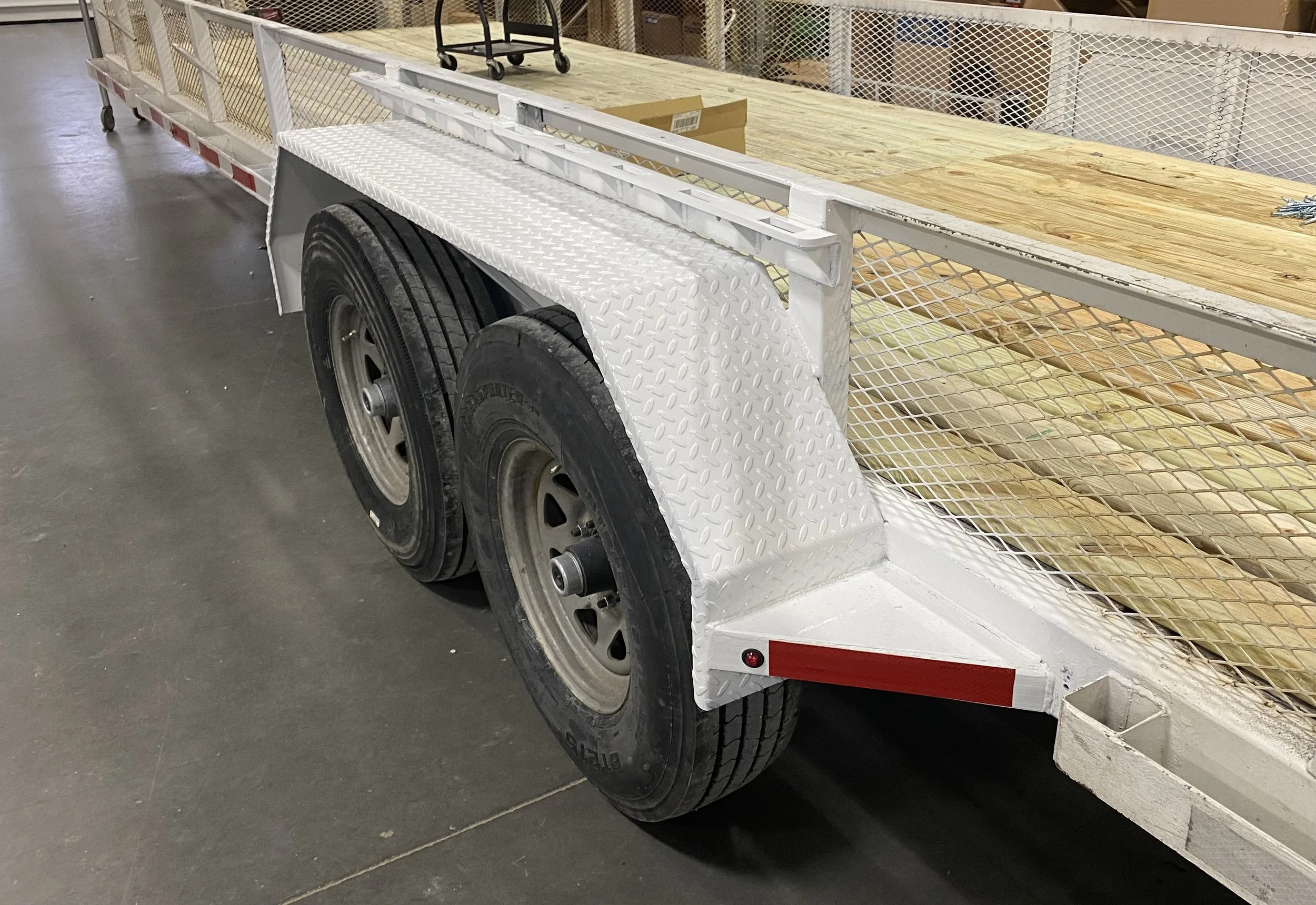 As you can see in the photo, we added a fender to frame brace between the wheels for added support. On this trailer we used 1” square tube for that brace. Doing this will help structurally, especially if you add a tie down on the top of the fender as shown above.